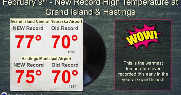 The National Weather Service Hastings office says afternoon temperatures climbed into the mid-70s across the local area Monday, with new record high temperatures reported at both Grand Island and Hastings. The high temperature of 77 reported in Grand Island was the warmest temperature ever recorded this early in the year since record keeping began back in 1895!